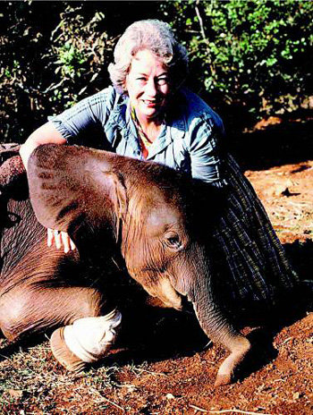 著者のダフニ・シェルドリックとアフリカゾウ「オルメック」が1989年、一緒に撮った写真。1987年、ケニア・マララ国立公園で救助されたオルメックは、当時、生後1ヵ月だったが、日焼けによる火傷まで負い、極めて衰弱した状態だった。しかし、デイビッド・シェルドリック野生動物トラストの保護を受け、健康を取り戻した後、野生に戻った。