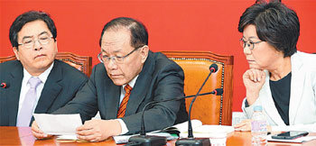 与党セヌリ党の黄祐呂(ファン・ウヨ)代表(真ん中)が13日、最高委員会議で中央党候補公認委員会から上がった文書を読んでいる。中央党候補公認管理委員会は同日未明、同党の済州道(チェジュド)知事候補選び選挙を100%支持率調査だけで行うことを確定した。黄代表の左と右は、沈在哲(シム・ジェチョル)、李恵薫(イ・ヘフン)両最高委員と、党内のソウル市長候補選び選挙に名乗りを上げた李最高委員は同日、最高委員職を辞退した。