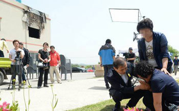 28日、全羅南道長城郡(チョルラナムド・チャンソングン)の高齢者向け療養型病院の火災で家族を失った遺族が、火災現場を見て涙を流している。