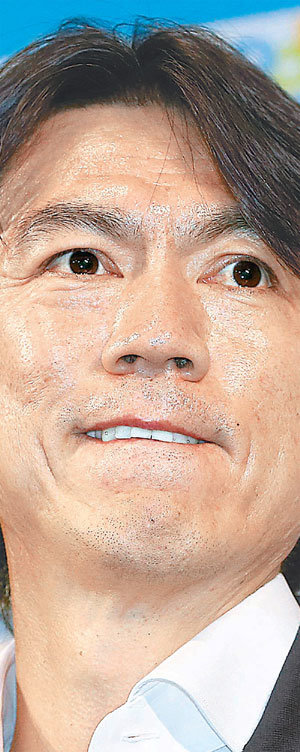 サッカー韓国代表の洪明甫(ホン・ミョンボ)監督が10日、ソウル鍾路区新門路(チョンノグ・シンムンロ)のサッカー会館で会見し、代表監督を辞退すると発表しながら、唇をかんでいる。固い表情で会見に臨んだ洪氏は、「国民のみなさんに申し訳ない」と言い残して、代表監督から退いた。