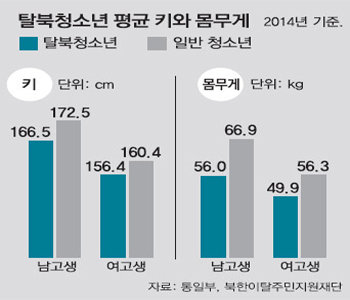 統一部や南北ハナ財団が、8歳から19歳までの脱北青少年744人を対象に行った「2014年、脱北青少年を巡る実態調査」によると、高等学齢期の男性の場合、一般青少年の平均身長は172.5センチなのに比べ、脱北青少年の平均身長は166.5センチだった。高等学齢期の女性の場合も、脱北青少年の平均体重は49.9キロで、一般青少年(56.3キロ)とのギャップを見せた。