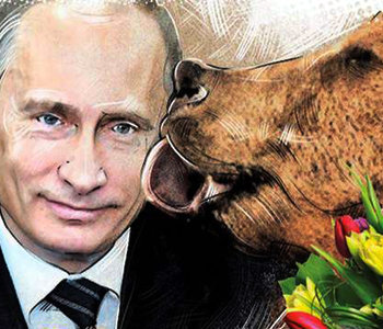 ロシアの与党機関誌が、最新号の表紙に1頭のクマがプーチン大統領の頬をなめる絵を掲載した。