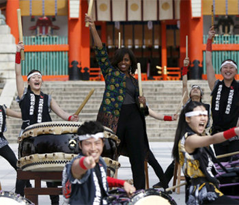 日本を訪問しているミシェル・オバマ米大統領夫人(真ん中)が20日、京都の伏見稲荷大社の前で高校生たちと和太鼓を演奏している。日本政府は、貧困層少女教育支援キャンペーン「レット・ガールズ・ラーン(Let Girls Learn)」活動を主導しているミシェル夫人に420億円を拠出することを発表した。(共同=ロイター・ニュース1)