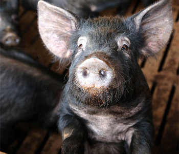 体長が1メートルにもならない在来豚は、斑点もなく真っ黒だった。しっぽは、「削除」を意味する校正記号のように巻かれていた。ピンと立った耳の間に小さな鼻が見えた。とても可愛い容貌だった。