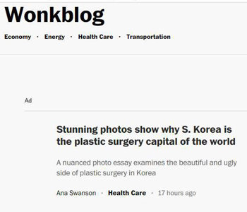 米紙ワシントンポストが、「整形手術共和国・韓国」の素顔を公開した。同紙は16日(現地時間)付けの自社ネット上の人気ブログ「ウォンクボルグ(Wonkblog)」を通じて、韓国の整形手術の実体について集中的にスポットライトを当てた記事や写真を流した。