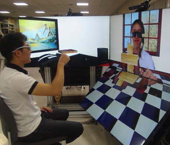 動作認識センター「キネクト(kinect)」を利用して、仮想現実の中の物体を操作する方法を考案した。まず、3Dテレビ3台をつなげた後、その上にセンサー2つを設置した。さらに、鏡に3Dテレビに出てくる映像を写して、センサーに仮想空間の座標を入力した。センサーが実際の空間で動くユーザーの動作情報を認識に、仮想と実際空間との座標情報を統合処理させたのだ。ユーザーは、立体眼鏡さえかければ、3D映像の中でまるで自分がものを動かしているような経験をすることができる。