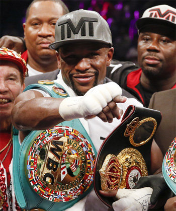 「世紀の拙戦」でボクシングファンから非難を浴びたフロイド・メイウェザー(38=米国・写真)が後味の悪い無敗記録を達成して引退した。世界ボクシング評議会(WBC)と世界ボクシング協会(WBA)のウェルター級(66.7kg)の統合チャンピオンは13日、米国ネバダ州ラスベガスのMGMグランド・ガーデン・アリーナで行われたアンドレ・ベルト(32=米国)との統合タイトルマッチで、審判全員一致の判定勝ちを飾った。