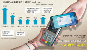 三星ペイ関連モジュールを生産しているアモテックも同様に同期間、株価が41.49%高騰し、三星ペイの決済システムが搭載される無線充電器を生産するハンソルテクニクスも、22.00%上昇した。決済代行業者(バン=VAN)の韓国情報通信は、三星ペイで小口決済が増えるだろうという期待を反映して、21.52%上昇した。有進(ユジン)投資証券・ミッドスモールキャップのパク・ジョンソン・チーム長は、「クレジットカードでは少額決済を嫌う消費者が多いが、三星ペイは、スマートフォンをかざすだけで済むので、小口決済が増えるだろう」と語り、「決済のたびに手数料が支払われる構造を持つ業者のへ恩恵が大きいだろう」と説明した。