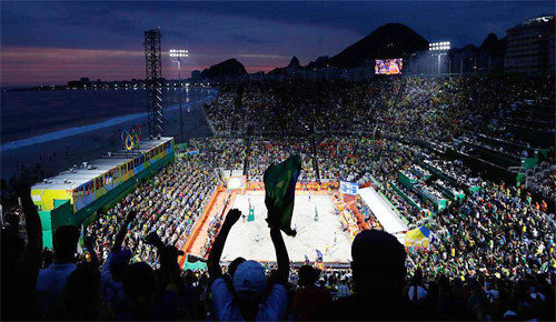 ビーチバレー競技場の中に入ると、ブラジルのサッカー代表チームのユニフォームを着た観客が観客席を埋め尽くしていた。その中の一人、カミラ・メル氏は、「米国の人たちは自分たちがビーチバレーを作ったと言っているが、コパカバーナビーチはビーチバレーの魂が生きている場所だ」と強調した。ブラジルがドイツを相手に得点を挙げるたびにサンバ音楽が会場に鳴り響いた。