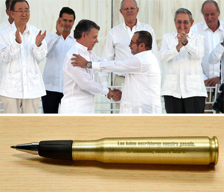 27日、AP通信などによると、コロンビア北部カルタヘナで、サントス大統領と同国最大の左翼ゲリラコロンビア革命軍(FARC)のロンドニョ最高司令官が、52年間続いた内戦を終える和平合意文書に署名した。両者は、内戦で使われた弾丸の弾皮を溶かして作ったペンで署名した。ペンの柄にはスペイン語で「弾丸は私たちの過去を記録した。教育は私たちの未来だ」という言葉が刻まれた。