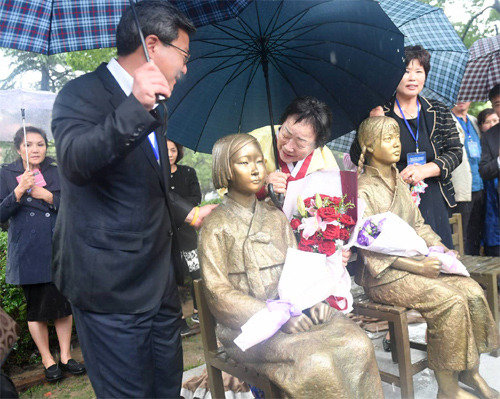 大雨の降った同日の除幕式には、元慰安婦である韓国人のイ・ヨンスさん(88)や中国人の陳連村さん(90)も出席した。イ・ヨンスさんは、少女像の顔に流れる雨水を拭きながら、「これからは寂しくないだろう」と話した。中国人慰安婦少女像の序幕は、慰安婦専門家である上海師範大学の蘇智良教授が推進し、韓国と中国の彫刻家たちが少女像を無償で寄贈した。慰安婦少女像は現在、韓国や米国、カナダ、豪州など約50ヵ国に設置されている。