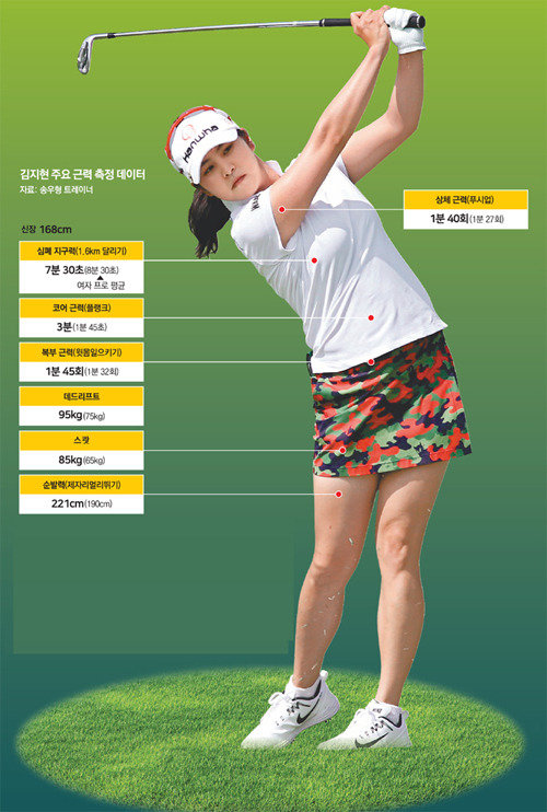 小学校時代にショートトラック選手をしたキム・ジヒョンは、下半身の筋肉サイズが他の選手に比べてはるかに大きい。子供のときから鍛え続けた経験から、つらくて地味な筋トレが体に大きく役立つことを良く知っている。これを通じて飛距離が15ヤード以上伸び、スピンがたくさんかかるアイアンショットは「名品」と褒め称えられている。キム・ジヒョンのトレーニングにアドバイスをしているチャ医科大学スポーツ医学大学院のホン・ジョンギ院長は、「下半身の筋力は抜群に高い。とくに下半身の最大の筋力は、並の選手に比べて100ポンドほど高かった。下半身の筋力が強いと、ラウンドを行う際に関節の安定性が高まり、安定したスイングが可能になりパフォーマンスを上げることができる」と評価した。筋肉質の太ももが好調の秘訣という意味だ。