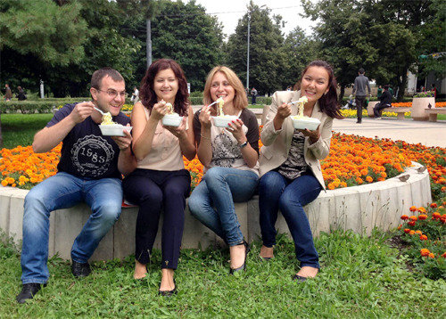 現地で最も人気のある味わいの一つは、「チキンの味」である。韓国にはないが、ロシアの消費者を狙って、辛さを抑えたチキンの味、キノコの味、エビの味などが現地で人気を得ている。箸の文化のないロシア消費者のために、2007年2月からは全製品にフォークを入れて発売している。