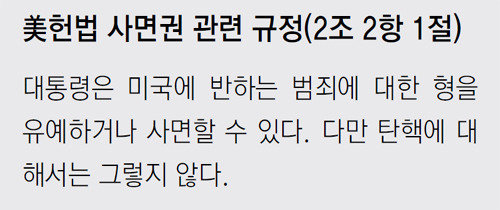 米憲法第2条第2項1節は、「大統領は犯罪について、刑の執行を停止し、または恩赦を与える権限を有する」と規定している。確定判決が下された事件に対してだけ大統領が恩赦権を行使できる韓国と違って、米国は大統領が量刑を減らしたり免除する方法で権限を行使できる。ロシア疑惑に関わった側近と家族を恩赦することで、ロバート・ミュラー特別検察官の捜査を制限し、事件を終結させるということだ。