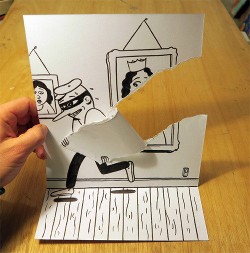 落書きのようで落書きだけではない立体的絵である。デンマークの作家フスク・ミット・ナヴン氏(42)は、このような似た形の作品の写真を集めて、新刊「紙人間」(ブックレシピ)を最近発行した。彼は、東亜(トンア)日報との電子メールでのインタビューで、「私は『いたずらっぽい芸術』を追求する。私が作り出すドローイングのイメージを見た誰かが、完全に別の方法の新しいドローイングを考え出すことを期待する」と語った。