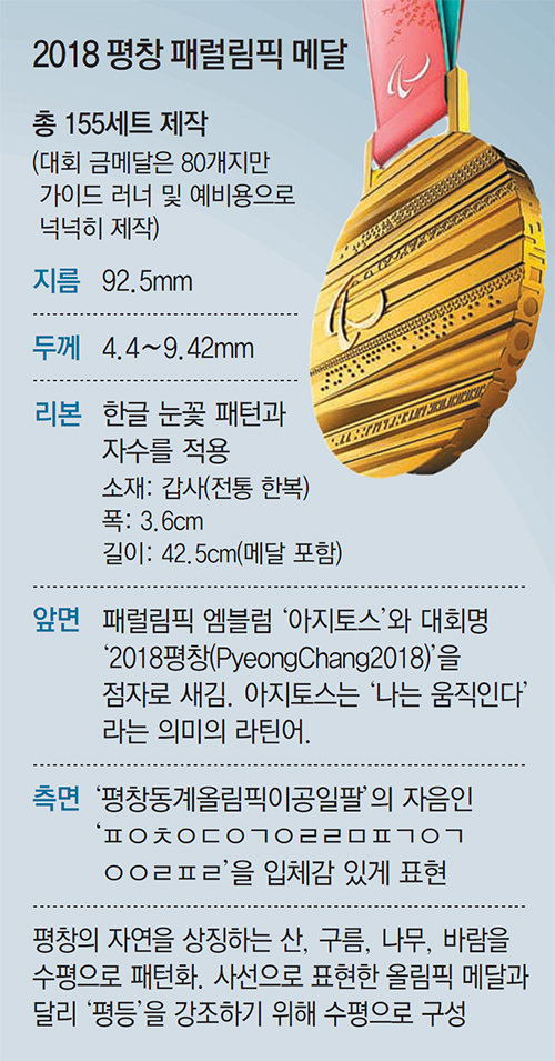 表には平昌の山と雲、木、風をパターン化して手触りで感じれるようにした。平昌の自然を斜線に表現した五輪メダルとは違って、パラリンピックのメダルは、「平等」を強調し、水平線でパターンを構成した。裏面には平昌パラリンピックのエンブレムとアジトス、そして細部種目名が記されている。