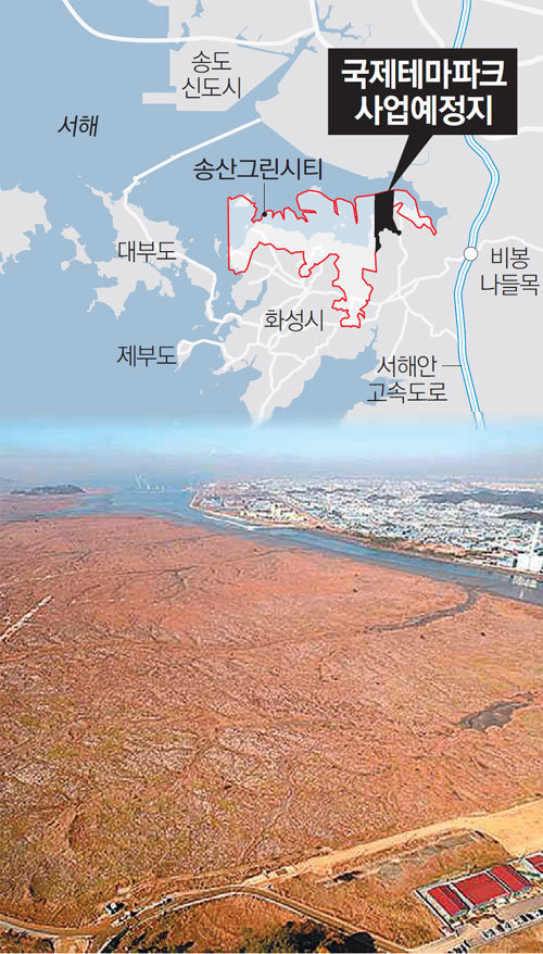 화성국제테마파크 사업은 시화호 남측 간석지의 송산그린시티 동쪽(화성시 남양읍 신외리) 420만 m² 터에 국제 수준의 테마파크를 조성하는 것이다. 이 땅의 소유주는 한국수자원공사다.