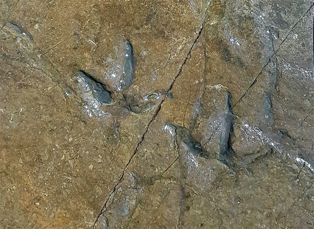 今回の調査は、縦横60×20メートルに及ぶ1200平方メートルを対象に行い、厚さが3~4メートルの河床堆積層を除去して出てきた岩盤から恐竜の足跡化石が確認された。肉食恐竜の足跡化石は、二足歩行する獣脚類4頭が残した歩行列の形であることが調査の結果分かった。足跡のサイズは長さが9~11センチ、幅は10~12センチである。草食恐竜の足跡化石は、二足や四足で歩く鳥脚類が残したものと把握された。