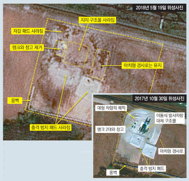 이 때문에 ‘6·12 북-미 핵담판’과 이후 종전선언이 성사되면 북한이 대북 경제제재 전면 해제 등을 조건으로 동창리 발사장의 ‘폐쇄카드’를 꺼내 들 것이라는 관측이 나온다. 거의 모든 미사일 개발이 끝나 발사장의 효용 가치가 다했다고 판단할 수 있다는 것이다. 동시에 막판까지 대미협상의 ‘히든카드’로 활용할 수도 있다. 고도의 연구시설과 발사장비가 갖춰진 동창리 발사장은 지하갱도로 이뤄진 풍계리 핵실험장과 동일선상에서 비교할 수 없다는 게 대체적인 평가다. 정부 당국자는 “북-미 수교나 평화협정 체결 전까지 발사장을 담보로 최대 실익을 챙기고 주요 기술진과 장비를 빼돌린 뒤 가장 늦게 폐쇄하는 수순을 밟을 개연성도 있다”고 말했다.