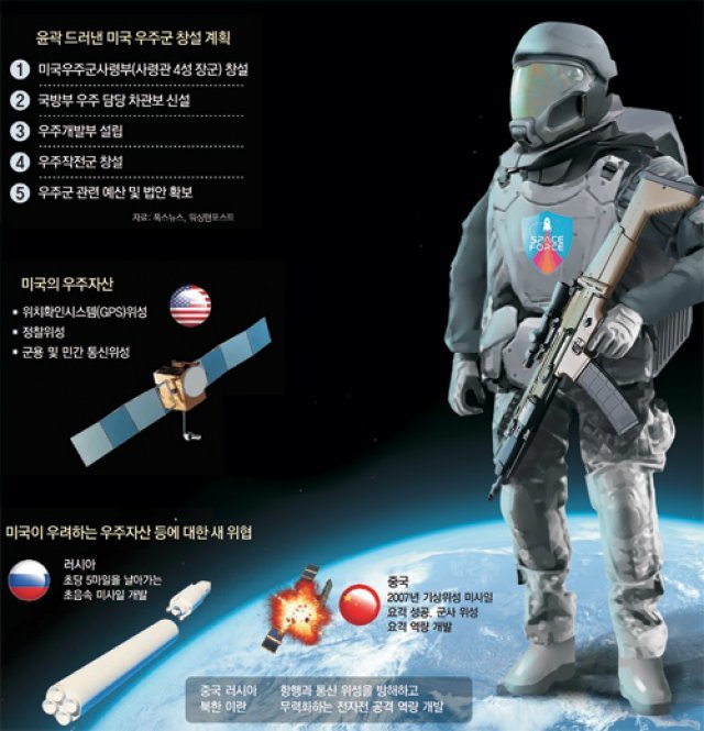 昨年まで「間接費を減らし、戦闘遂行能力の統合に力を入れなければならない時」とし、宇宙軍創設に反対していたマティス国防長官は、最近、「宇宙が接戦が繰り広げる戦争の領域になっている」と支持に回った。現在の空軍傘下の宇宙司令部が独立して宇宙軍に拡大・再編されれば、陸海空軍、海兵隊、海岸警備隊の5軍体制が6軍体制に変わることになる。