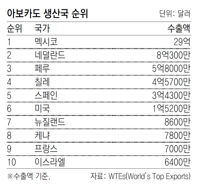 「森のバター」と呼ばれるアボカドは、チーズのようにソフトな食感だ。ほかの果物や野菜に比べて脂肪が多いが、主に不飽和脂肪酸なので健康食として人気がある。ハンバーガーやサンドイッチ、サラダにベーコンやささみの代わりにアボカドを入れる料理法も流行している。2017年の世界のアボカドの輸出額は60億ドルで、前年対比約34%の増加だ。