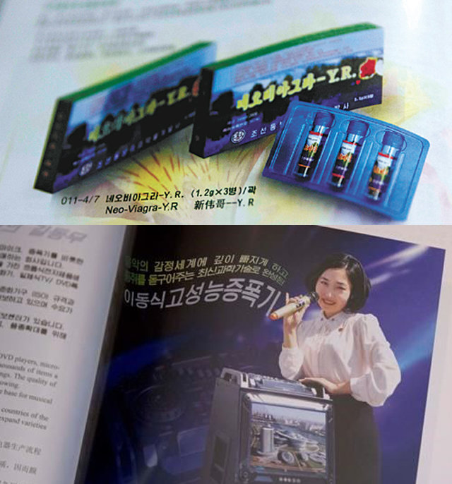 北朝鮮の国際貿易振興委員会が、北朝鮮の新製品を広報するために発刊した207ページの「2018朝鮮の商品」には、ダチョウの革から液晶テレビ、「最高の性機能補助剤」というネオ‐バイアグラ(にせバイアグラ)、奇跡のがん治療新薬まで様々な種類の製品が含まれている。医薬品の場合、高麗(コリョ)時代まで遡る独自の技術で生産したと宣伝している。中国人観光客をターゲットにしたものだが、特に健康補助剤「血宮不老精(Royal Blood Fresh)」は、高麗航空の平壌の~北京路線で機内広告するほど有名だ。