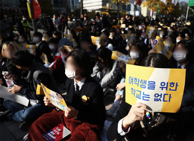 「生徒の日」である3日午後、ソウル中区(チュング)にあるソウルファイナンスセンター前。制服姿で集まった中高生250人(主催側試算)が歌「師匠の恩恵」の歌詞を変えて大声で歌った。青少年フェミニズム会など30余りの団体が、「スクールMeToo(私もやられた)」をテーマに開いた「女子生徒のための学校はない」と題した集会でのことだ。4月にソウル蘆原区(ノウォング)にある容華(ヨンファ)女子高で行われた最初のスクールMeToo以降、生徒たちがこれをテーマに広場に集まったのは初めてだ。