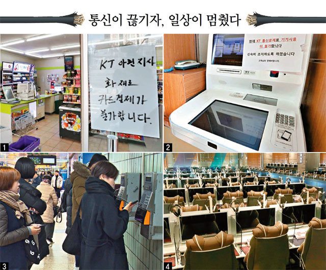 25日、ポータルやソーシャルネットワークサービス(SNS)は、麻痺した日常で埋め尽くされた。店にはクレジットカードの決済ができず、現金のみを受け取るという案内文が掲げられ、予め現金を確保できなかった市民たちは、KTではないネットワークを使う現金自動預け払い機(ATM)を探して街をさまよった。初雪の降った週末、恋人、友達と新村(シンチョン)、弘益(ホンイク)大学前などで約束をしていた人たちは、突然連絡が途切れて地団太を踏んだ。ネットカフェやゲームセンターなどは、強制的に開店休業の状態になった。