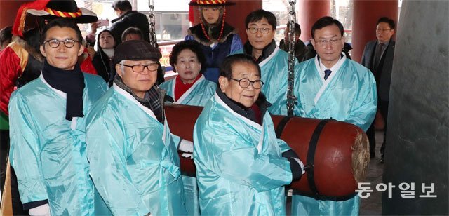 3・1節を50日後に控えた同日、鐘打ち式には元老放送人の宋海(ソン・ヘ)氏、俳優の全元珠(チョン・ウォンジュ)・崔鍾元(チェ・ジョンウォン)・鄭漢溶(チョン・ハンヨン)氏、朴其烈(パク・ギヨル)ソウル市議会副議長、アン・ヨンベ東亜(トンア)日報論説委員など36人が参加して3・1独立精神を振り返りながら普信閣の鐘を一緒に鳴らした。独立運動家の子孫であるチャ・ヨンジョ「孝昌園7位の先烈記念事業会」会長も鐘打ち行事に参加した。