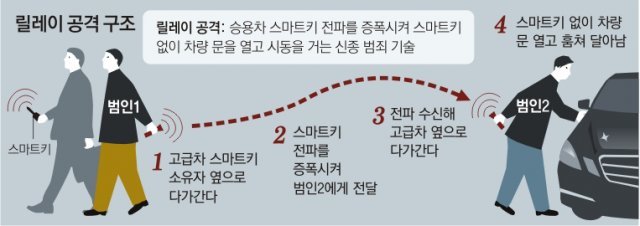 一般的な車のスマートキーは、半径1.0~1.5メートル内で作動する。リレーアタックを受けると、スマートキーが車から10メートル以上離れていても、車を動かせる可能性があることを狙った。また、窓を割らなくてもよく、犯罪の痕跡が残らず、検挙も難しい。