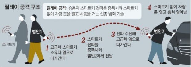 당시 이 모습이 담긴 폐쇄회로(CC)TV를 분석한 일본 경시청은 이 2인조가 차량을 훔치기 위해 ‘릴레이 공격’을 한 것으로 결론 내렸다. 릴레이 공격은 2인조가 스마트키 전파를 증폭시켜 차량을 훔치는 신종 범죄수법. 한 사람은 스마트키 소유자 옆에서 스마트키 전파를 증폭시켜 공범에게 전달하고, 공범은 증폭된 전파를 수신해 차량을 여는 식이다. 두 절도범이 릴레이하듯 전파를 주고받는다는 뜻에서 이 이름이 붙었다.