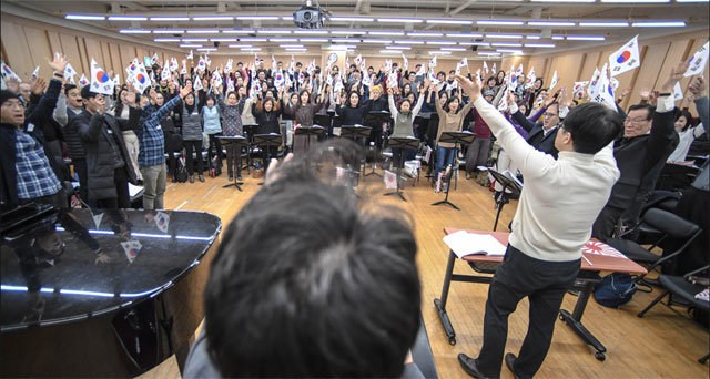 この曲を作った作曲家のイ・ヨンジュ氏が、演出家として練習を主導した。指揮を引き受けたカン・ギソン・ソウル市合唱団の芸術総監督は、後ろから指揮棒を振り回しながらリズムと強弱を整えた。シーンが変わって、柳寛順役のソプラノ・ソ・ソンヨン氏が「私の耳と手がすべて切られて折れても、国を奪われ、踏みにじられた現実は認められない」と歌い、合唱団がハミングで歌って、この日の練習は幕を閉じた。市民合唱団員たちの目元に涙が浮かんだ。