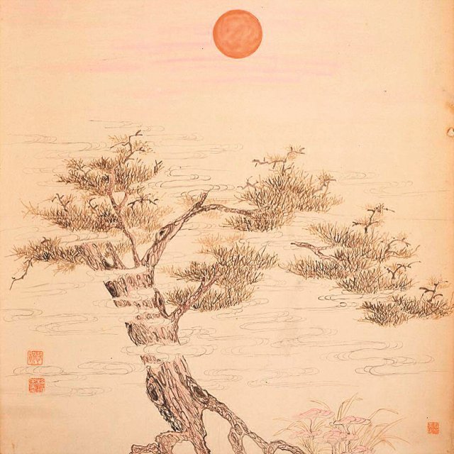 国王を意味する赤い太陽と長生きを意味する霊芝、雲などを画面のあちこちに描か入れた。画面の中心に位置する根を露出させた松は、高宗が子供の頃に乗って遊んでいた雲峴宮(ウンヒョングン)の「正二品大夫松」と非常に似ている。これが西洋紙に朝鮮の伝統的画風が結合された独特の魅力の「昇日蟠松図」だ。