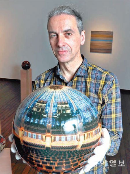 ドイツ・ウルムで生まれた彼は、美術や物理学を一緒に学んで、工学にも関心が高い。完全な球の形態を作り、その上に写真がきっちりつながるように付けた後、エポキシコーティングを数回かぶせる「球」の作品制作に通常一ヶ月がかかる。手で作ることに集中する工芸的側面が強い。