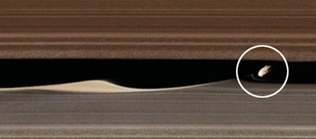上から見れば、うず巻きが輪の中心に現れ、「プロペラ」と呼ばれる構造も詳しく観測された。輪の中に直径100メートルほどの小さな天体が輪を構成する小さな氷と岩石の微粒子の間を通過する過程でこのような現象が起こる。