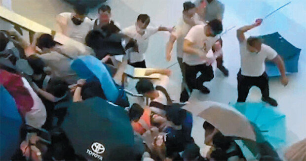 サウスチャイナ・モーニング・ポストによると、21日午後11時頃、白い上着とマスクを着用した10人ほどの男たちが、地下鉄・元朗駅に現れ、鉄パイプや棒を振り回し、デモ参加者や市民を無差別に暴行した。彼らは、列車の客室に避難した乗客まで追いかけて暴行し、構内は大混乱となった。この様子は、現場にいた市民がカメラで撮影し、オンライン上に拡散された。