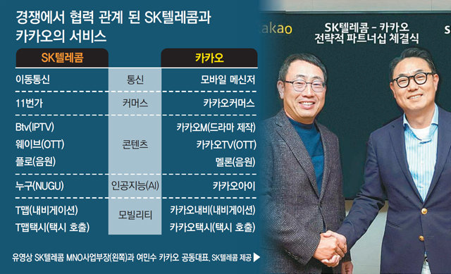 SKテレコムとカカオが持分を対等交換(持分スワップ)することを発表すると、ICT業界ではこのように分析した。2010年にカカオトークの登場後、両社は事あるごとに対立する関係だった。一時は1兆ウォンを超えていたSKTのテキストメッセージ市場をカカオトークが食い込んだのに続き、ボイストークで音声通話市場まで脅かした。元々SKTのサービスだったが、カカオに渡された音源サービス「メロン」と一歩遅れて再び始めたSKTの「フロー」、モビリティプラットフォーム「Tマップ」と「カカオT」、AIサービス「ヌグ」と「カカオアイ」まで激しい競争を繰り広げている。