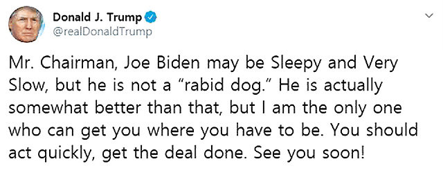 韓米両国が今月中旬に予定されていた合同空軍演習を突然延期したのは、実務陣の反対を押し切ったトランプ米大統領の決定によるという。トランプ氏は17日(現地時間)、ツイッターで、金正恩(キム・ジョンウン)朝鮮労働党委員長に対して、「私はあなたをあるべきところに導くことができる唯一の人物だ」とし、「迅速に行動し、交渉をまとめるべきだ」と強調した。正恩氏に、中国、ロシアに接近して「新しい道」を模索するなと迫ったものとみられる。また、「近いうちに会おう」とし、3回目の米朝首脳会談への意向を明らかにした。トランプ氏がこのツイッターを投稿したのは、演習延期発表の10時間後だった。先月、ストックホルムの実務協議が決裂して以降、米朝協議関連の初の反応でもある。