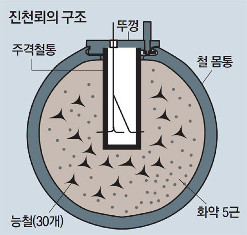 震天雷は、砲弾に火を付ける点火装置である「柱檄鉄」を砲弾に入れて、敵陣で爆発するように設計された時限爆弾だ。朝鮮仁祖(インジョ)の時に兵曹判書を務めた李曙(イ・ソ)が1635年に著した火薬武器兵書「火砲式諺解」によると、震天雷は鉄で113近(67.8キロ)の丸胴を作り、その中に火薬5斤(3キロ)とブラケット形状の菱鐵(鉄びし)30個を詰めた。爆発時間の調節は、「柱檄鉄」という長い構造物に入れた導火線で行った。導火線に火をつければ、導火線が燃えていき、一定時間が過ぎたら、火薬に触れて爆発する。まるで手榴弾が爆発するように、胴体の破片と鉄びしが飛び出して、敵を攻撃したと推定される。