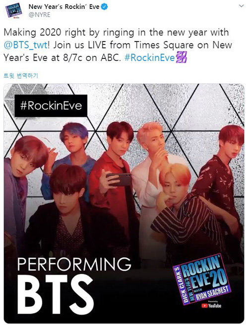 BTSは31日、米ニューヨークのタイムズスクエアで行われるABCの毎年恒例の大晦日のテレビ特別放送「ディック・クラーク・ニュー・イヤーズ・ロッキング・イブ(Dick Clark's New Year's Rockin' Eve)」に出演する。今年で48回目の同放送は、米現地に於いて最大規模で行われる大晦日ライブショーだ。