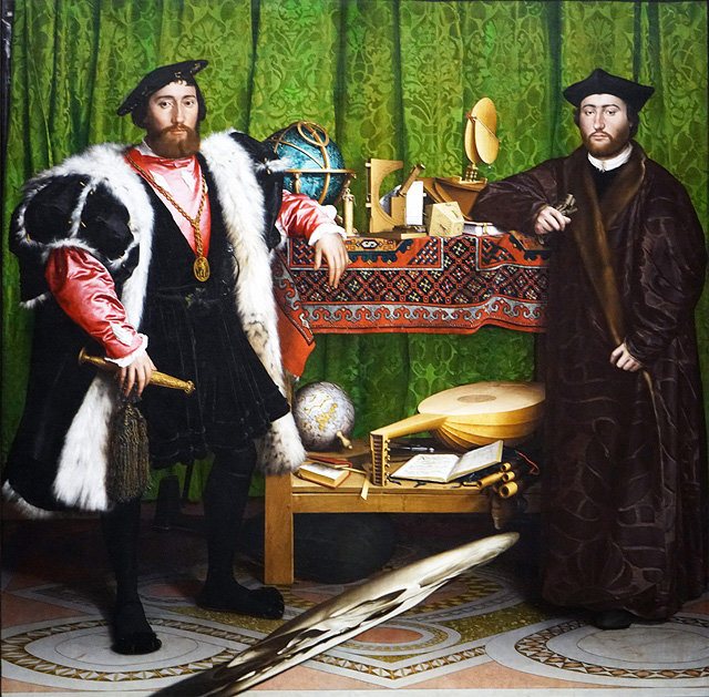 大使とは、最高権力者から命を受けて、外国に派遣された外交使節のことを言う。大使を意味する英語「アンバサダー」の語源はラテン語「Ambactus」で、臣下、家来などの意味がある。ハンス・ホルバインの「大使たち」は、16世紀の大使の姿を時代像と共に描いた傑作だ。ドイツ生まれだが、英国の宮廷画家として働いていたホルバインは、1533年、フランス大使らのロンドン訪問を記念してこの絵を描いた。縦、横がそれぞれ2メートルを超える巨大な画面の中には、実物大の二人の男が登場する。彼らは、緑のカーテンを背景に、珍しいものがのせられた棚を挟んで立っている。高価な毛皮コートをかけた堂々とした左の男性は、当時29歳のジャン・ド・ダントヴィルで、フランソワ1世が英国のヘンリー8世に送った外交使節だ。右側の男性は、ジャンの友人であり聖職者だったジョルジュ・ド・セルヴで、当時25歳だった彼も、後日、フランス大使となる。