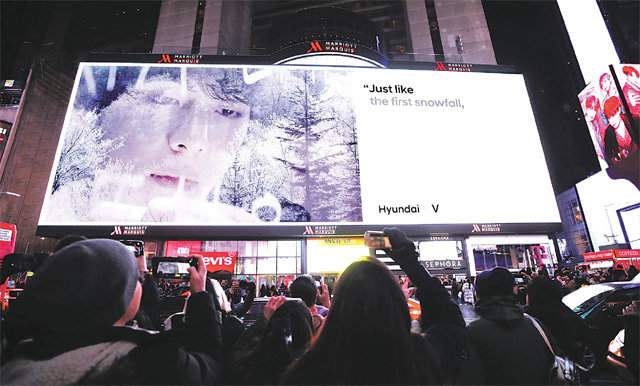現代自は21日午後(現地時間)、米ニューヨーク・タイムズスクエアのマリオットマーキスホテルの屋外電光板を通じて水素キャンペーンの映像を上映したと、23日明らかにした。「美しい大自然が人生に与える感動」をテーマにした1時間の映像には、BTSのメンバー7人がそれぞれ空、雪、森というハングルを手書きで書く姿が盛り込まれている。続いて現代自の水素電気自動車「ネクソ」が登場して、現代自動車が力を入れている未来の水素社会の青写真を紹介した。一日の流動人口だけで150万人に達するタイムズスクエアでは、映像が流れる間、BTSのファンや観光客がそれぞれのスマートフォンとカメラで電光掲示板を写真で撮ったりした。