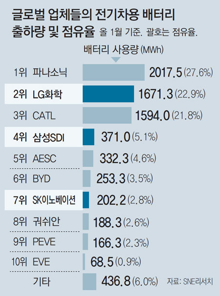 2日、グローバル市場調査会社・SNEリサーチが今年1月、電気自動車のバッテリー出荷量基準メーカーシェアを調査した結果、LG化学が22.9%のシェアでパナソニック(27.6%)に次いで2位となった。三星(サムスン)SDIとSKイノベーションは、それぞれ5.1%(4位)と2.8%(7位)を占めた。これにより、韓国国内バッテリーメーカー3社のシェア合計は30.7%で、前年同月(14.2%)に比べて2倍以上成長した。韓国メーカーのシェア合計が30%台を超えたのは今回が初めてだ。