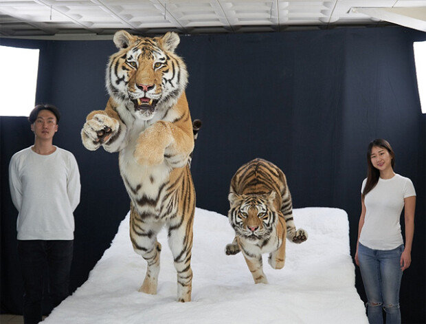 서울대공원은 시베리아 호랑이 두 마리를 박제해 17일 공개했다. 두 호랑이는 15, 16년가량 대공원에서 사육되다 2016년과 2018년 자연사한 ‘한울이’와 ‘코아’다. 서울대공원 관계자는 “자연사한 멸종위기종이나 희귀종을 박제한다. 해부학적으로 정확하게 고증해 동물 박제를 만든다”고 말했다.