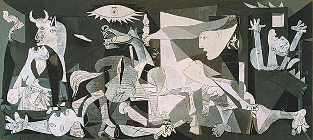 絵には、死んだ子供を抱いて絶叫する女、折れた剣を握って倒れた兵士、傷ついて泣き叫ぶ動物、嗚咽する女、手足が切断された遺体など、戦場で見られる悲惨な姿が絡まっている。キュービズム様式で描かれた白黒トーンの巨大な画面は、奇怪でありながらも、戦争の悲劇を生々しく伝える魅力があった。絵はパリでの展示後、世界巡回展示を経て反戦の象徴となった。ミューズだけを描いていたピカソに反感を持っていた人も、「ゲルニカ」の前では敬意を表した。第二次世界大戦中にパリがナチスに占領されたとき、ピカソの作業室を訪れたナチス将校がゲルニカの写真を見て尋ねた。「この絵は、君が描いたものか?」。ピカソは「いいえ。あなたたちがやったことだ」と答えた。彼の答えは事実だった。ゲルニカの悲劇がなかったら、ミューズ画家のピカソが反戦画家になる理由は全くなかったのだから。