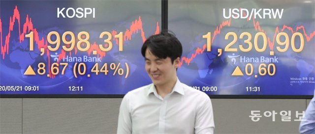 21日、コスピは取引中2000ポイントを行き来した末、前取引日より0.44%(8.67ポイント)高の1998.31で取引を終えた。コスピが取引中2000ポイントに達したのは3月6日(終値は2040.22)以降初めてだ。終値基準でも、この日以来最も高い。コスダック指数は前日より1.02%上がって、3営業日連続の上昇を見せた末、年中最高点である716.02で取引を終えた。