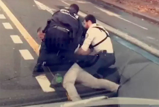 シュビアさんは、「私は間違ったことはしていないのになぜ」と言うと、一人の警官が性的な冗談を言って嘲笑った。シュビアさんと警官の間で小競合いになった。警官4人がシュビアさんを地面にうつ伏せにし、首を圧迫して手錠をかけようとした。シュビア氏は22秒間に7回も「息苦しい」、「窒息しそうだ」と言った。