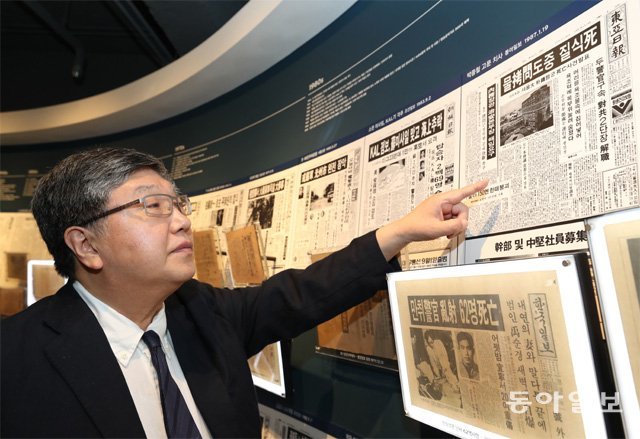 新聞博物館の展示物を観覧したオ氏の足が1987年1月19日、東亜日報の紙面の前で止まった。1面トップの題名は「水拷問途中に窒息死」。東亜日報が6面を拷問関連告発記事でいっぱいになった日だった。オ氏は、「あの日の新聞がずっと頭の中に残った」と話した。その後、本紙は大々的な拷問追放キャンペーンを行う一方、事件の縮小、隠蔽、捏造を告発した。
