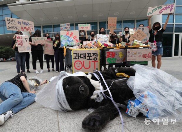 2일 오전 서울 성동구 이마트 앞에서 비닐봉투를 뒤집어쓰거나 목에 두른 20여 명의 시민들이 모여 구호를 외쳤다. 3일 ‘일회용 비닐봉투 없는 날(Plastic bag free day)’을 맞아 플라스틱 포장재를 줄이자는 메시지를 전달하기 위해 모인 환경단체 회원들이다.