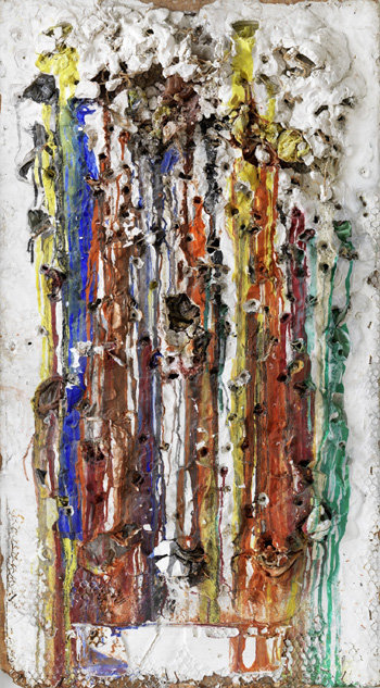 美術教育を受けたことのないド・サン・ファルは、別名「射撃絵画(Shooting Painting)」でフランス画壇に彗星のように登場した。塗料のポケットを隠した白いリリーフに銃を撃って、塗料が四方に跳ねて流れる前衛的な抽象画で、作家の幼い頃のトラウマに起因した作品だった。
